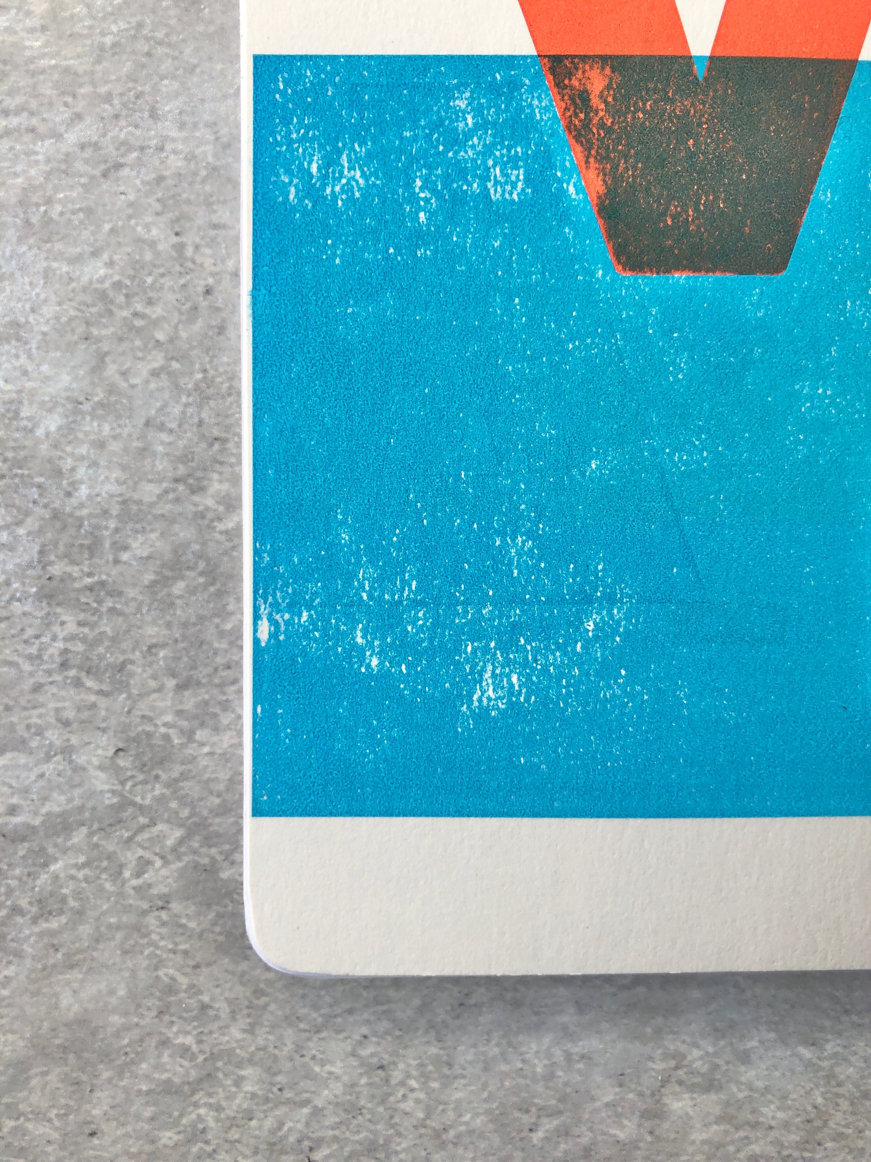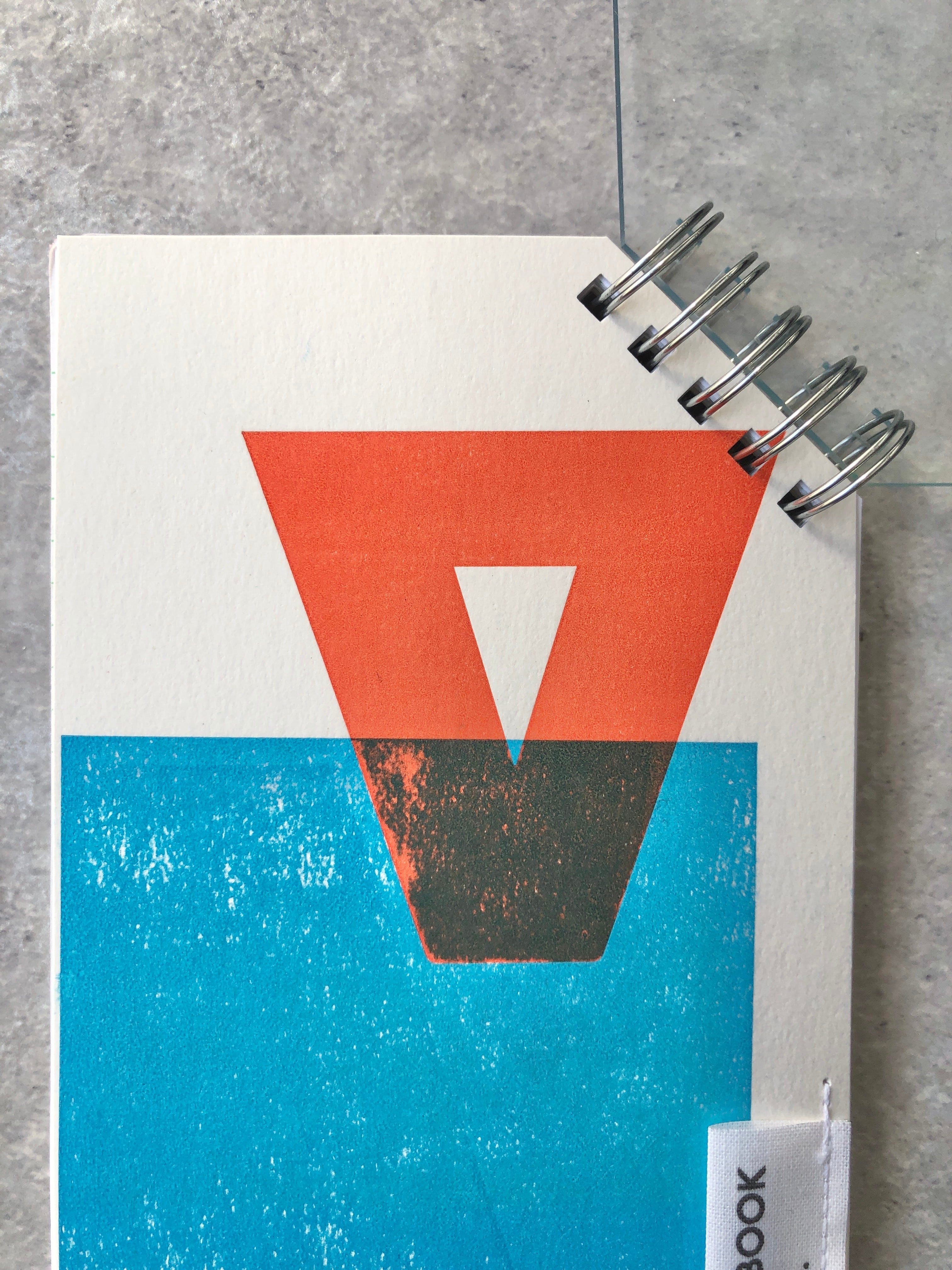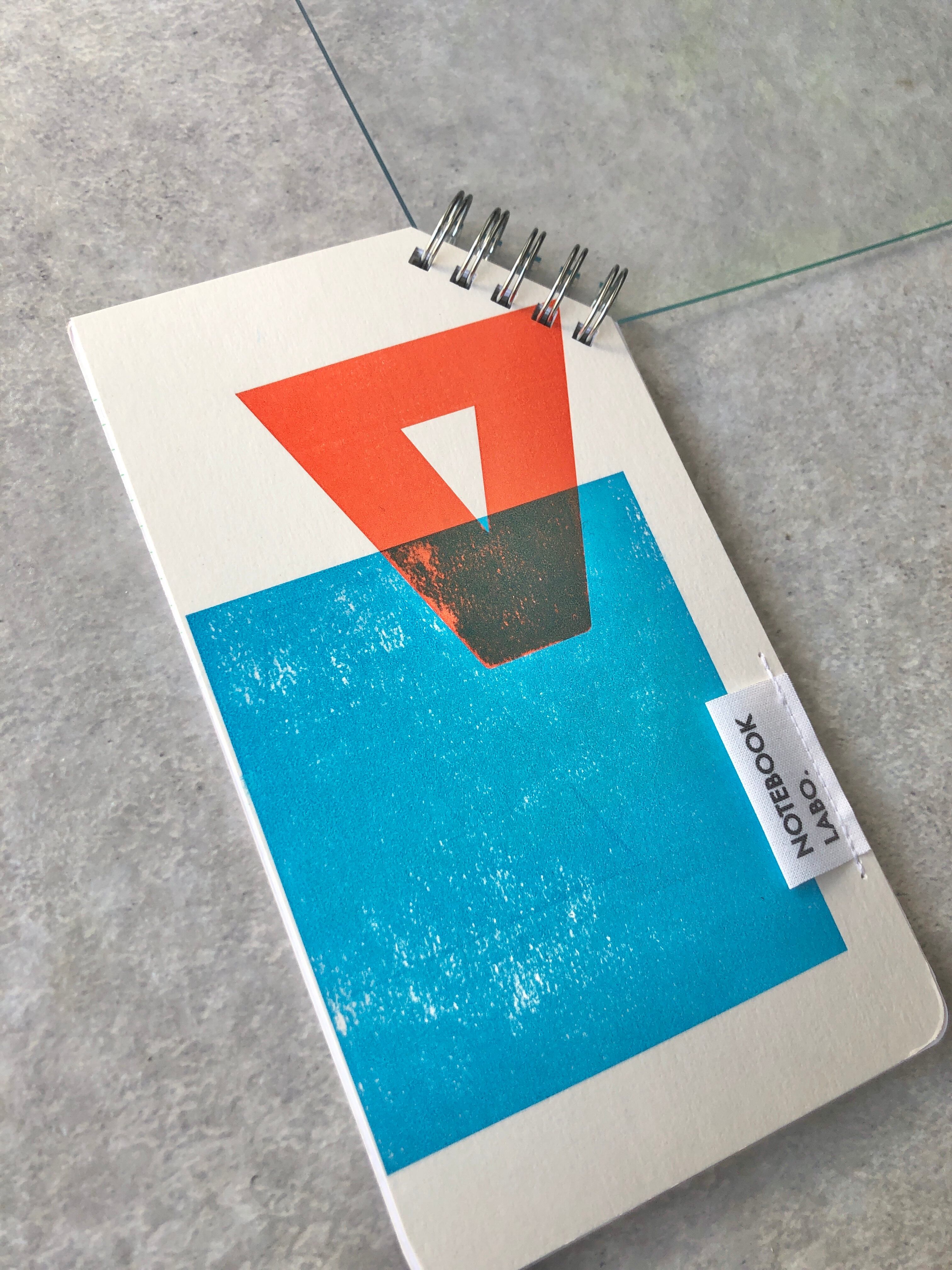中表紙は、印刷スタジオで活版印刷されたもの。スタジオから刷り損じた厚紙を買い取り、本店でノートへとアップサイクルした一点物です。鮮やかな色彩と、凸版印刷ならではの紙の凹みが特徴です!