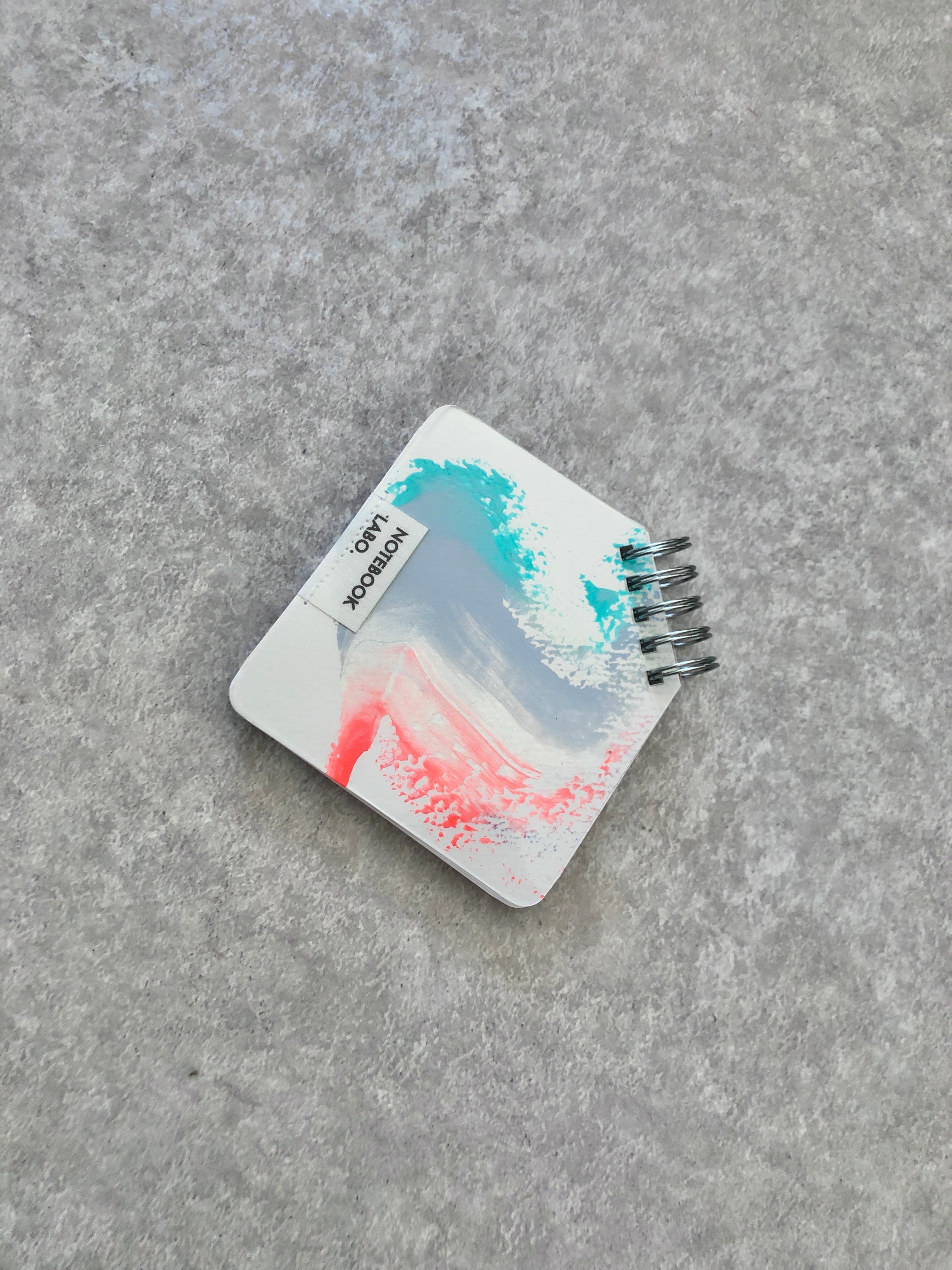 中表紙:紙にアクリル絵具でペイント。ブランドタグを刺繍。
